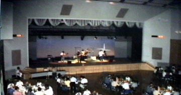 全国各地から身障者の方達が五十崎町 まで来られての車いすでの競技大会である その前夜祭アトラクションでのライブ ボランティアの方達のお世話にもなり 食事しながら聴いて頂いた。 |